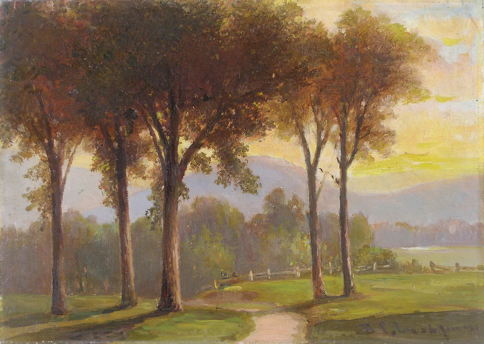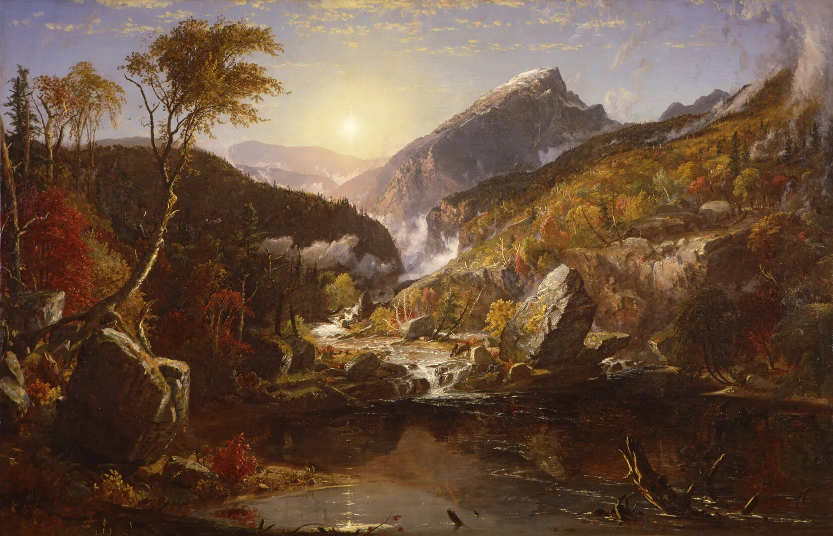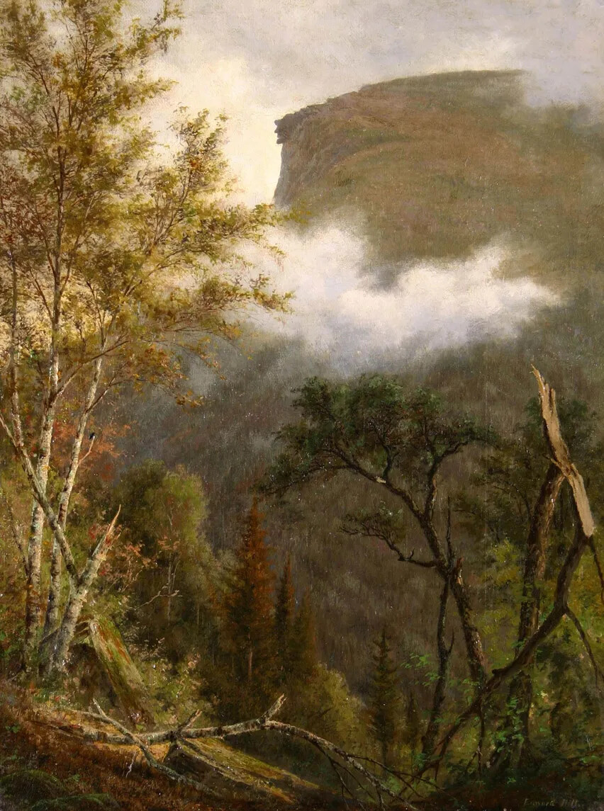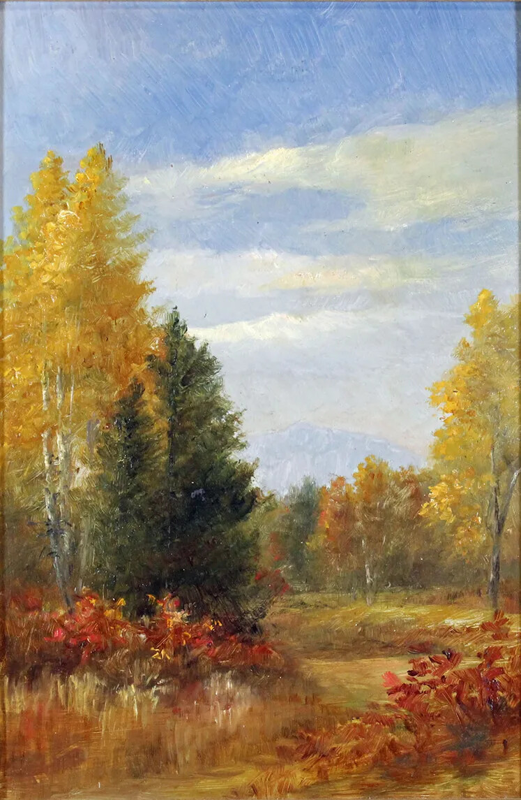 The White Mountain school art, which is a specific style rather than an actual school, focuses on large, sweeping landscape paintings that emphasize the power and glory of nature against the contrast of the insignificance of man. White Mountain art also tended to emphasize solitude and a pastoral sense of harmony and tranquility. The White Mountains’ rugged natural beauty and sparsely settled landscape served as the perfect subject and backdrop for artists seeking to capture this Romantic ideal on canvas. Although artists painted scenes of New Hampshire in all seasons, depicting the vibrant colors of a New Hampshire autumn was a particularly popular theme. The White Mountain style of art was similar to the Hudson River School, which flourished at roughly the same time in upstate New York. In fact, many artists painted in both regions. These two schools of painting sought to create a uniquely American style of art, one that could challenge notions about the superiority of the European masters. Europe had its grand cities, its cathedrals, and its ancient ruins—America had the grandeur of an untouched and unspoiled natural world.
