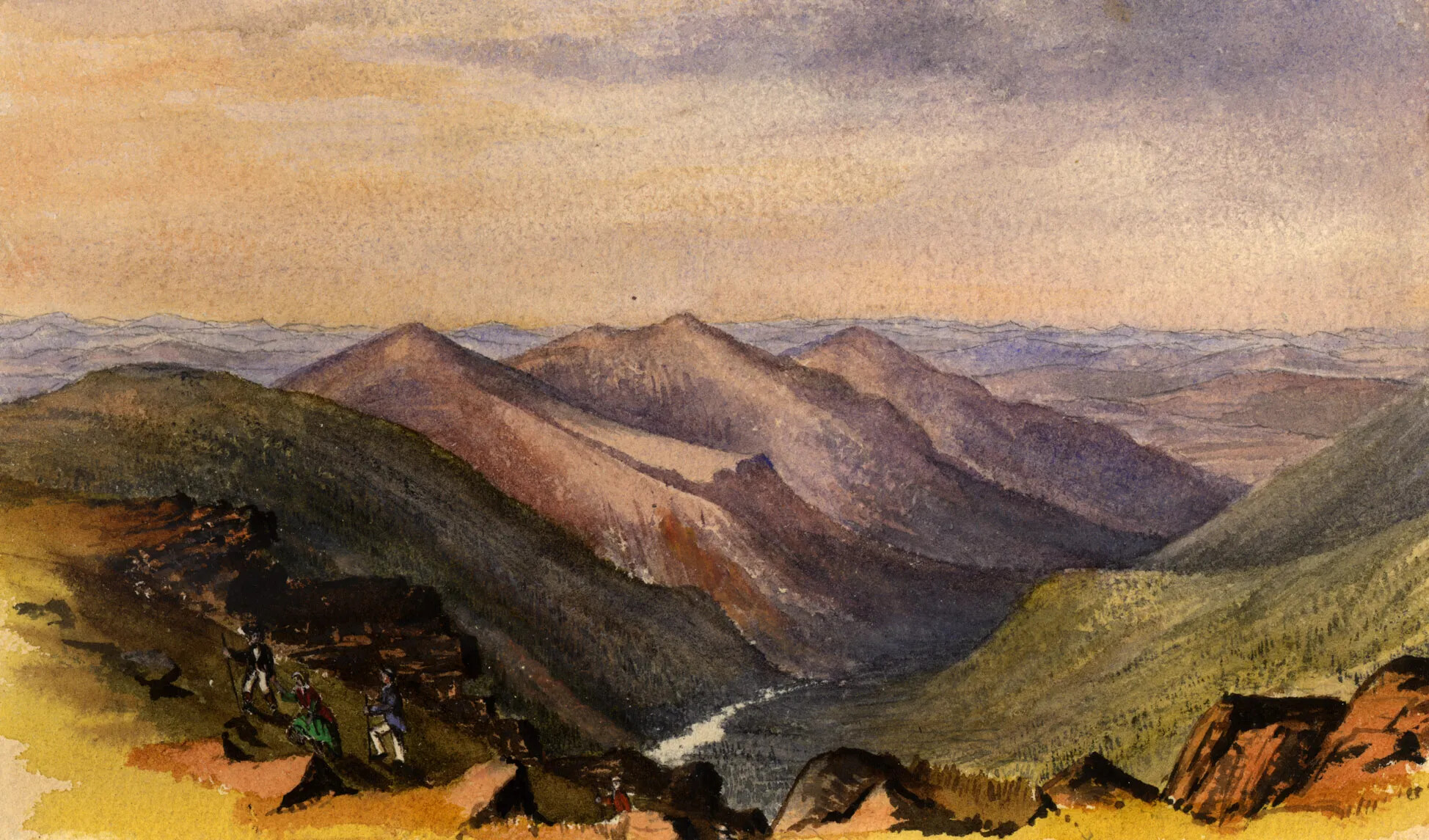 Like many of New Hampshire’s early tourists, artists were initially attracted to the White Mountains in the aftermath of the 1826 tragedy of the Willey family, when Samuel and Polly Willey, their five children, and two hired hands were killed while fleeing a mudslide that rushed toward their home. Coupled with the events of the tragedy, romanticized stories and works of art created by writers and artists in the wake of the disaster heightened the allure of the White Mountain region. For the remainder of the 19th century, as the tourist industry in New Hampshire grew, so too did the desire for White Mountain art. In total, an estimated 450 artists created works in the White Mountain style.